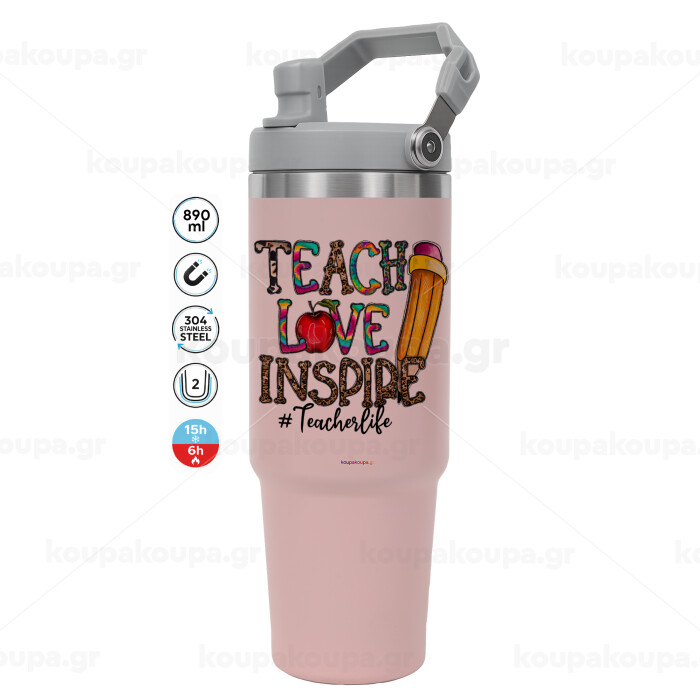 Teach, Love, Inspire, Pink color, 890ml (30oz) stainless Steel Tumbler with Handle