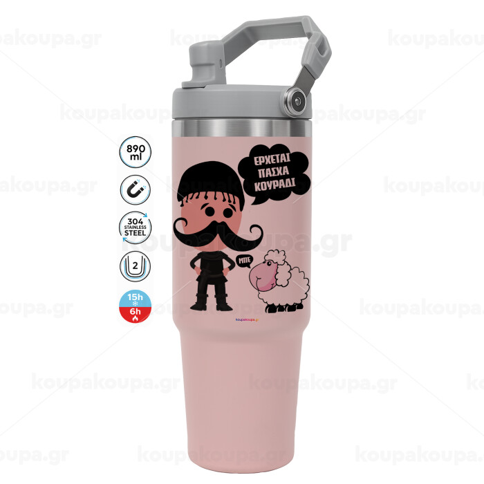 Κρητικός "Έρχεται Πάσχα κουράδι", Pink color, 890ml (30oz) stainless Steel Tumbler with Handle