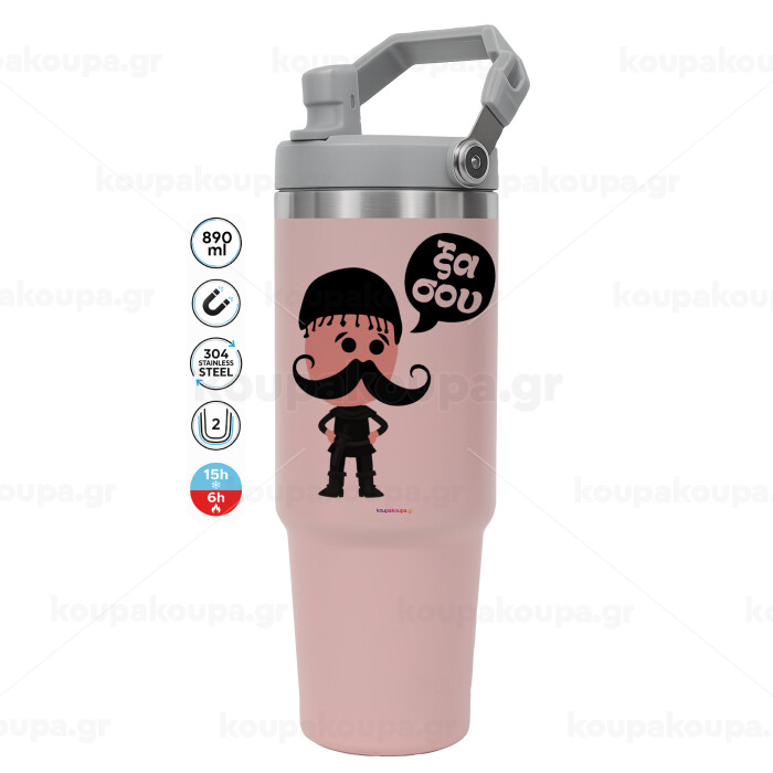 Κρητικός "Ξα σου", Pink color, 890ml (30oz) stainless Steel Tumbler with Handle