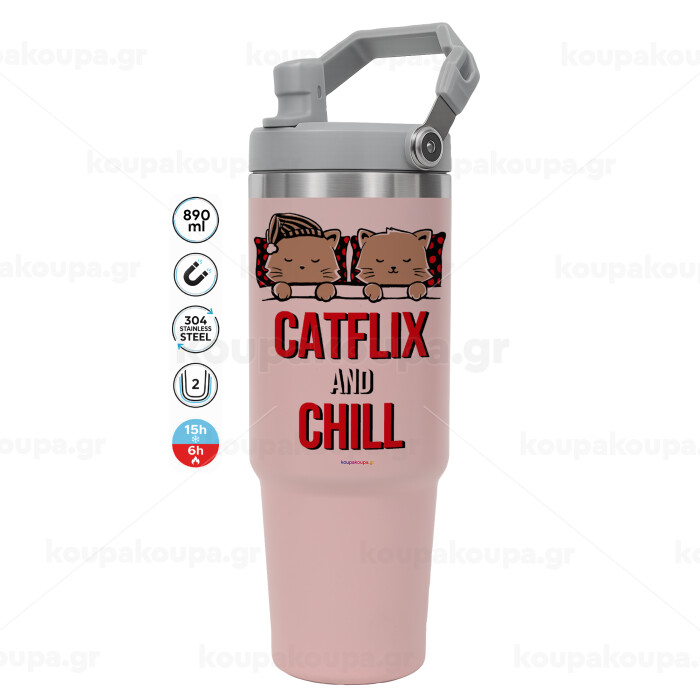 Catflix and Chill, Pink color, 890ml (30oz) stainless Steel Tumbler with Handle