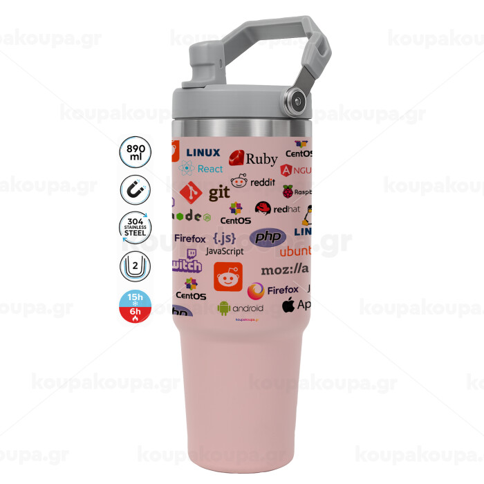 Tech logos, Pink color, 890ml (30oz) stainless Steel Tumbler with Handle