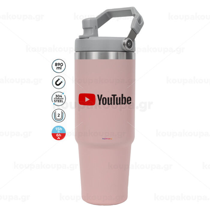 Youtube, Pink color, 890ml (30oz) stainless Steel Tumbler with Handle