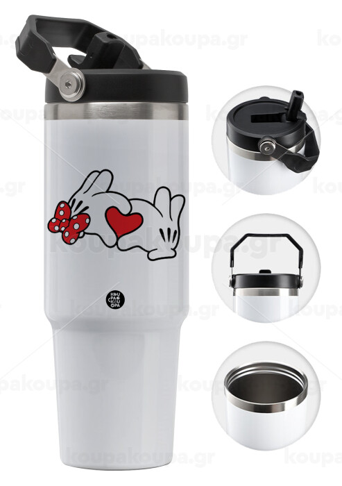 Discover the Stainless Steel Thermos 30oz with Handle, the ideal companion for every moment of the day, at home, at work or on the go. Made from 304 stainless steel on the inside, safe for food, and 201 stainless steel on the outside for maximum durability in use. It keeps your beverage hot for up to 12 hours and cool for up to 6 hours, ideal for coffee, tea, water or soft drinks. Large volume for hydration all day without frequent refills. Design with built-in straw and handle for comfortable use and easy transport everywhere. Thanks to the large opening, it is easily cleaned after each use.