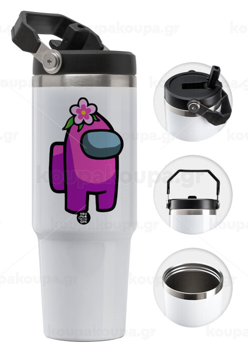Discover the Stainless Steel Thermos 30oz with Handle, the ideal companion for every moment of the day, at home, at work or on the go. Made from 304 stainless steel on the inside, safe for food, and 201 stainless steel on the outside for maximum durability in use. It keeps your beverage hot for up to 12 hours and cool for up to 6 hours, ideal for coffee, tea, water or soft drinks. Large volume for hydration all day without frequent refills. Design with built-in straw and handle for comfortable use and easy transport everywhere. Thanks to the large opening, it is easily cleaned after each use.