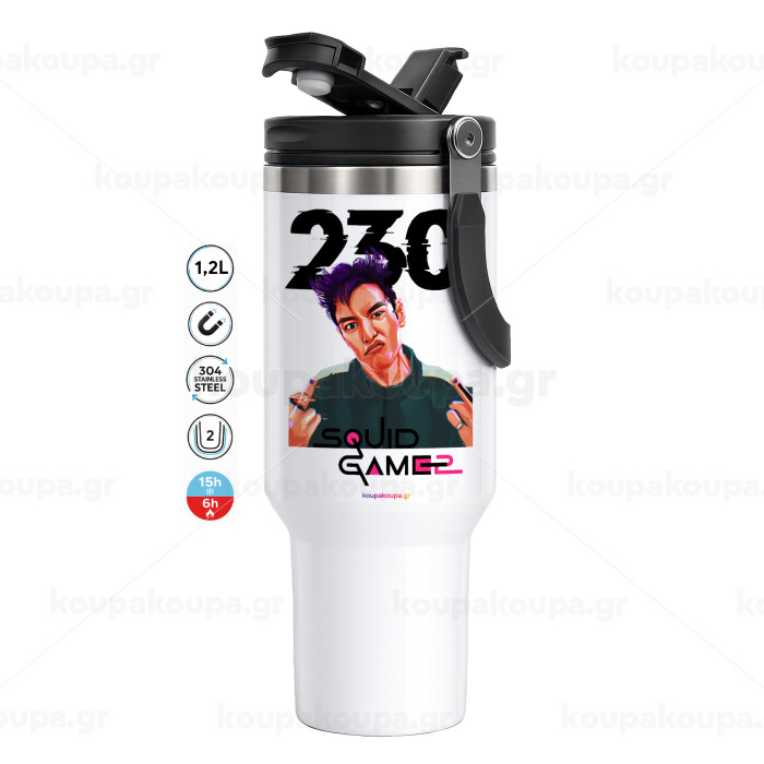 Squid game 456 Gi-Hun, Mega Stainless steel Tumbler with lid, double wall 1,2L