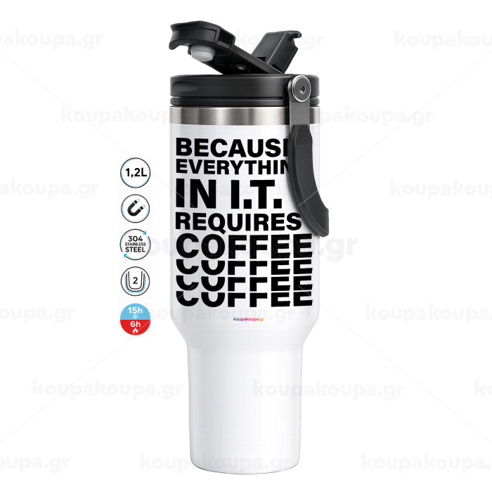 Because everything in I.T. requires coffee, Mega Stainless steel Tumbler with lid, double wall 1,2L