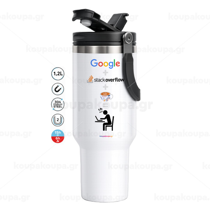 Google + Stack overflow + Coffee, Mega Stainless steel Tumbler with lid, double wall 1,2L