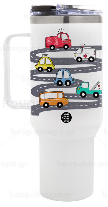 Hand drawn childish set with cars, Mega Stainless steel Tumbler with lid, double wall 1,2L