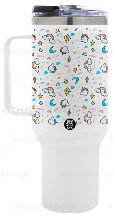 Unicorn pattern white, Mega Stainless steel Tumbler with lid, double wall 1,2L