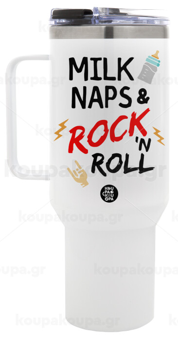 milk naps and Rock n' Roll, Mega Stainless steel Tumbler with lid, double wall 1,2L