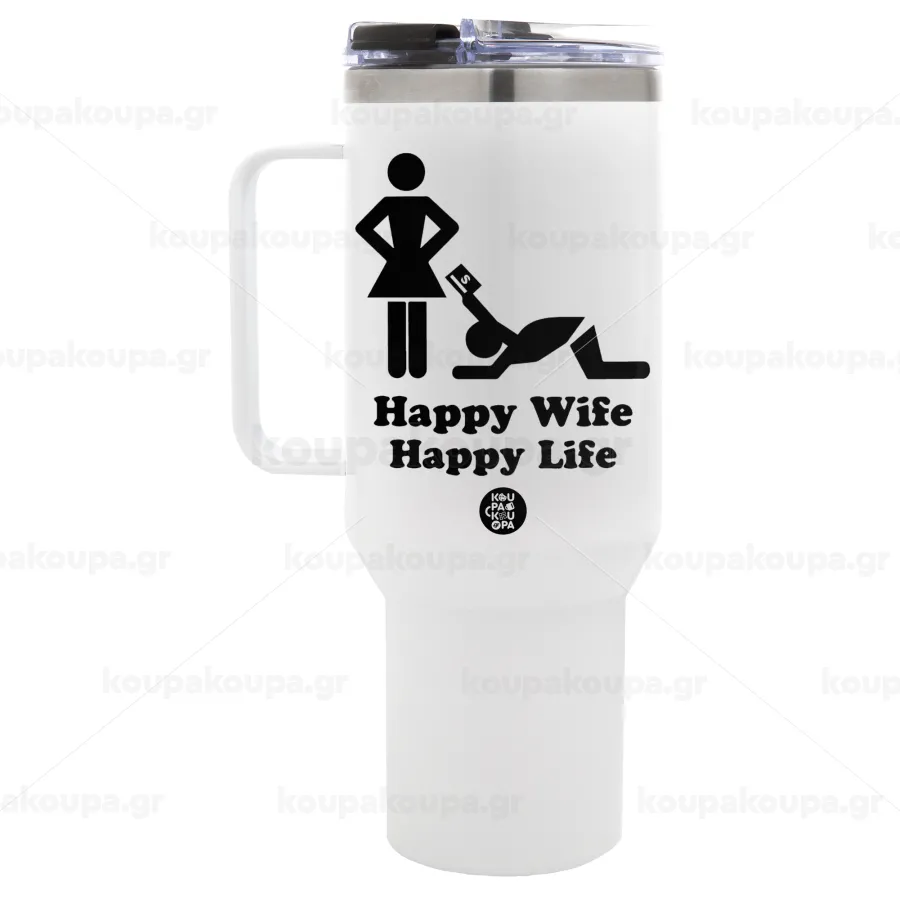 Happy Wife, Happy Life, Mega Stainless steel Tumbler with lid, double wall 1,2L