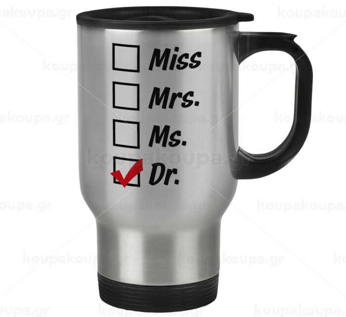 Miss, Mrs, Ms, DR, Stainless steel travel mug with lid, double wall 450ml