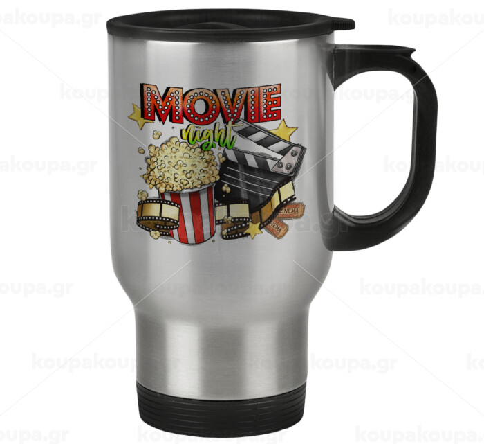 Movie night, Stainless steel travel mug with lid, double wall 450ml