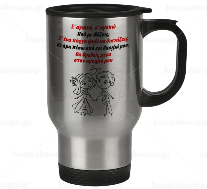 Σ΄ αγαπώ σ΄ αγαπώ που με βάζεις, Stainless steel travel mug with lid, double wall 450ml