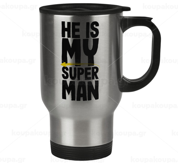 He is my superman, Stainless steel travel mug with lid, double wall 450ml