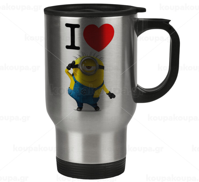 I love by minion, Stainless steel travel mug with lid, double wall 450ml