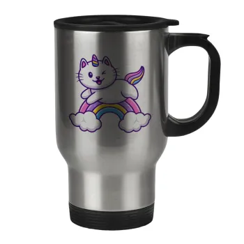 Cute cat unicorn, Stainless steel travel mug with lid, double wall 450ml