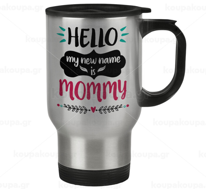 Hello, my new name is Mommy, Stainless steel travel mug with lid, double wall 450ml
