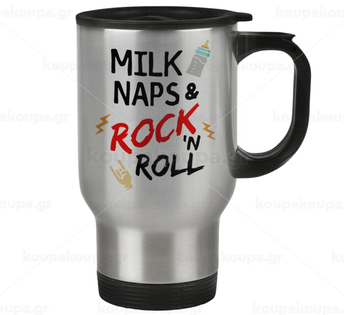 milk naps and Rock n' Roll, Stainless steel travel mug with lid, double wall 450ml