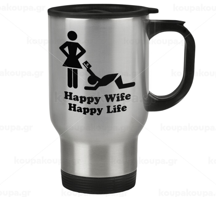 Happy Wife, Happy Life, Stainless steel travel mug with lid, double wall 450ml