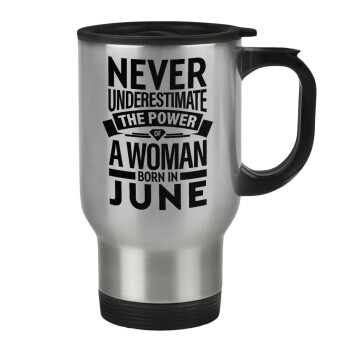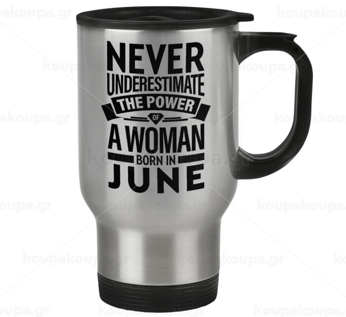 Never Underestimate the poer of a Woman born in..., Stainless steel travel mug with lid, double wall 450ml