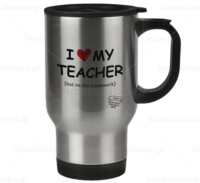 i love my teacher but no the homework, Stainless steel travel mug with lid, double wall 450ml