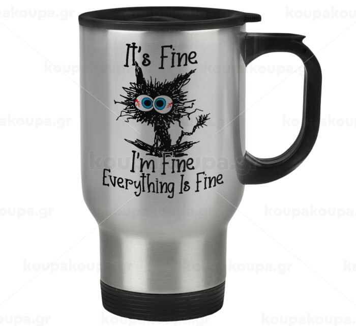 Cat, It's Fine I'm Fine Everything Is Fine, Stainless steel travel mug with lid, double wall 450ml