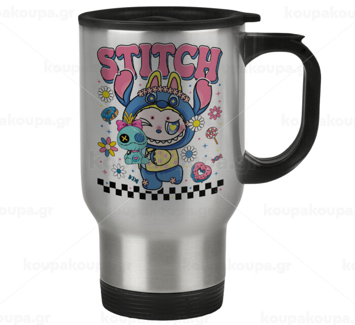 Labubu Stitch, Stainless steel travel mug with lid, double wall 450ml