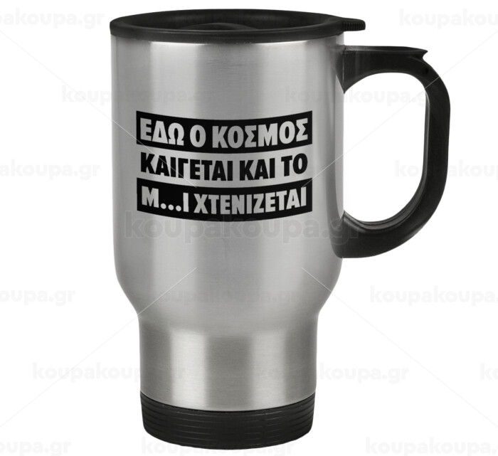 Εδώ ο κόσμος καίγεται και το Μ....Ι χτενίζεται, Stainless steel travel mug with lid, double wall 450ml