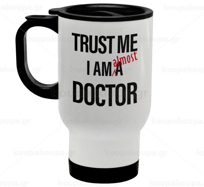 Trust me, i am (almost) Doctor, Stainless steel travel mug with lid, double wall white 450ml