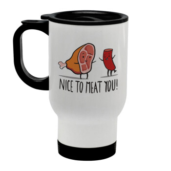Nice to MEAT you, Stainless steel travel mug with lid, double wall white 450ml