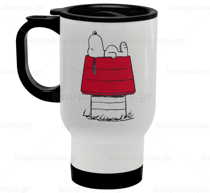 Το σπίτι του snoopy, Stainless steel travel mug with lid, double wall white 450ml