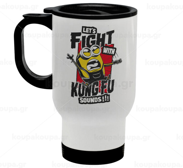 Minions Let's fight with kung fu sounds, Stainless steel travel mug with lid, double wall white 450ml