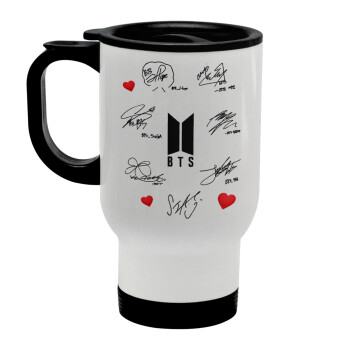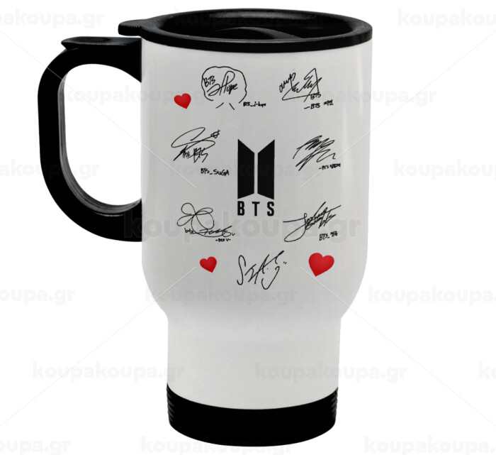 BTS signatures, Stainless steel travel mug with lid, double wall white 450ml