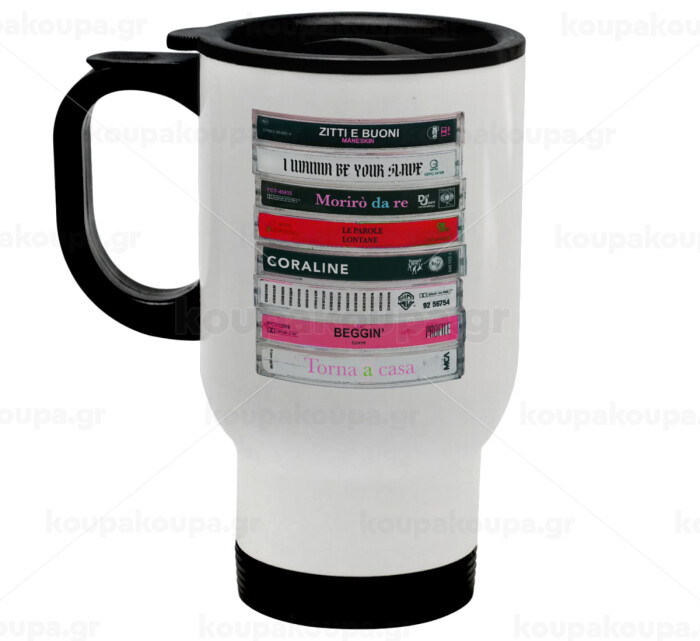 Maneskin Cassette, Stainless steel travel mug with lid, double wall white 450ml