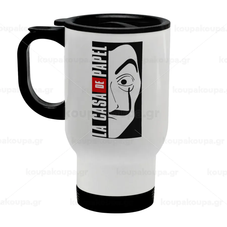 La casa de papel vertical, Stainless steel travel mug with lid, double wall white 450ml