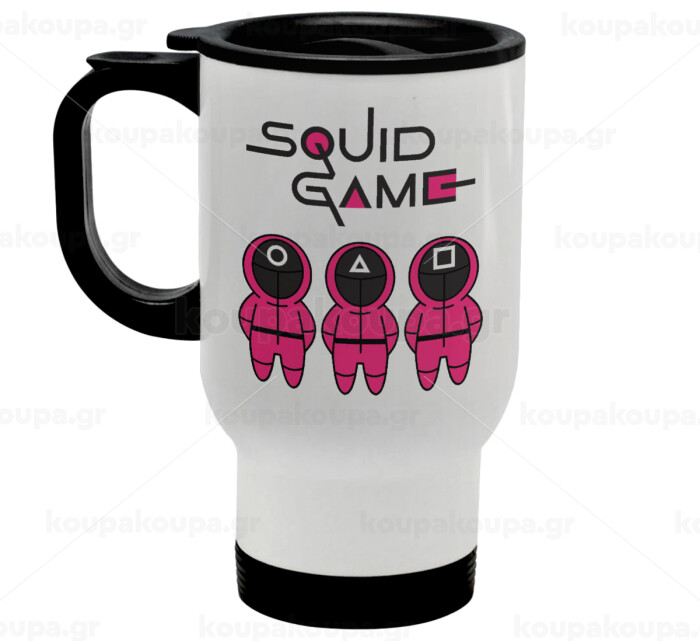 The squid game characters, Stainless steel travel mug with lid, double wall white 450ml