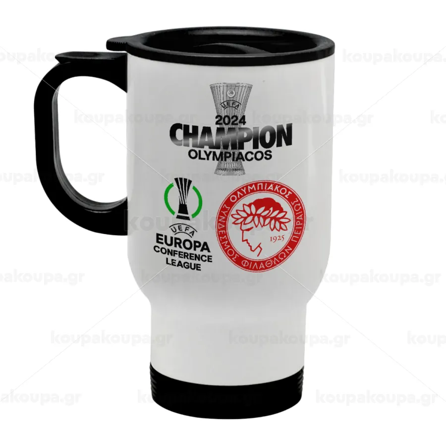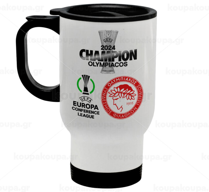 Olympiacos UEFA Europa Conference League Champion 2024, Stainless steel travel mug with lid, double wall white 450ml
