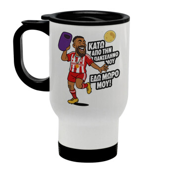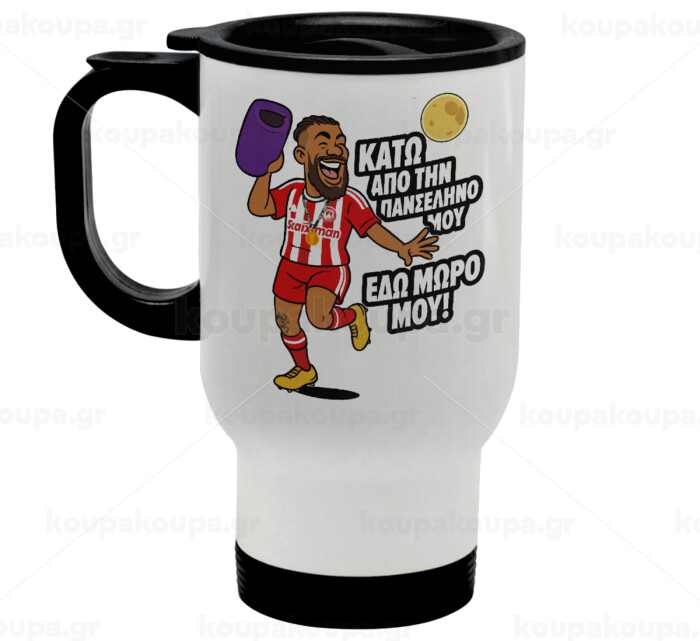 Ροντινέι, "ΚΑΤΩ ΑΠΟ ΤΗΝ ΠΑΝΣΕΛΗΝΟ ΜΟΥ!", Stainless steel travel mug with lid, double wall white 450ml