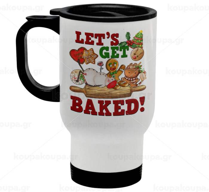 Let's get baked, Stainless steel travel mug with lid, double wall white 450ml