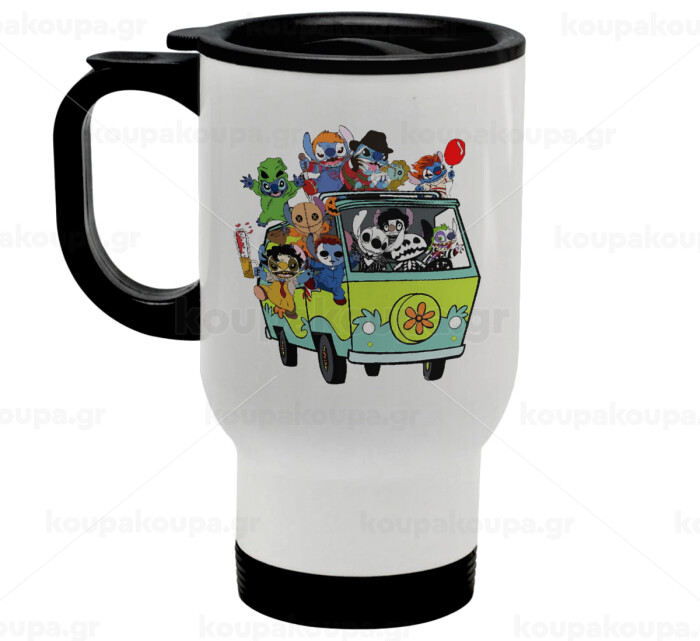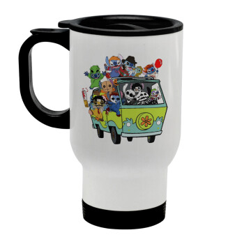 Stitch Halloween scooby car, Stainless steel travel mug with lid, double wall white 450ml