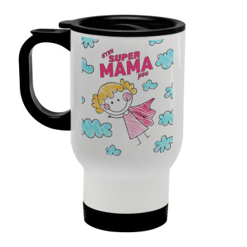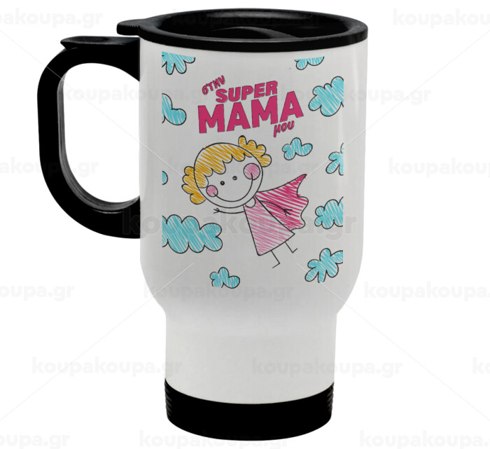Στην SUPER μαμά μου, comic, Stainless steel travel mug with lid, double wall white 450ml