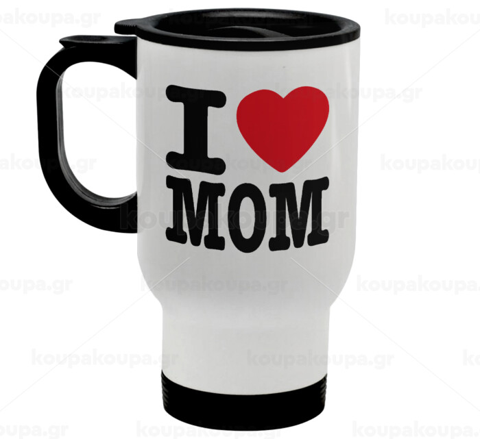 I LOVE MOM, Stainless steel travel mug with lid, double wall white 450ml