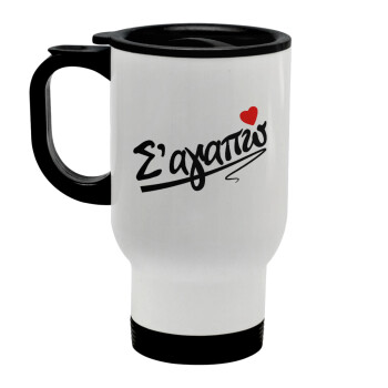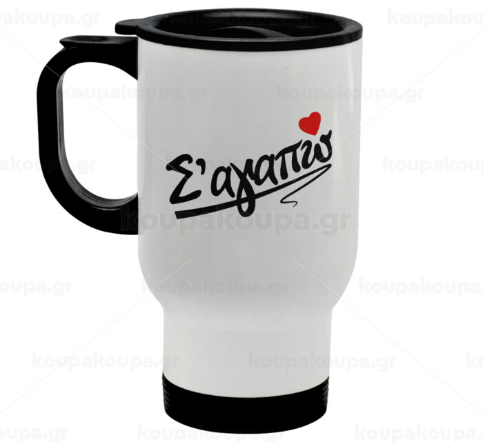 Σ΄ αγαπώ!!!, Stainless steel travel mug with lid, double wall white 450ml