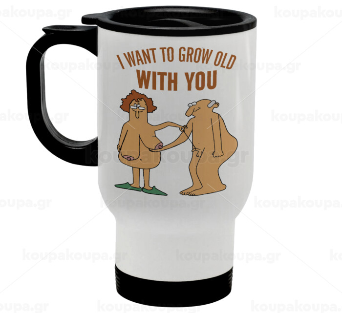 I want to grow old with you, Stainless steel travel mug with lid, double wall white 450ml