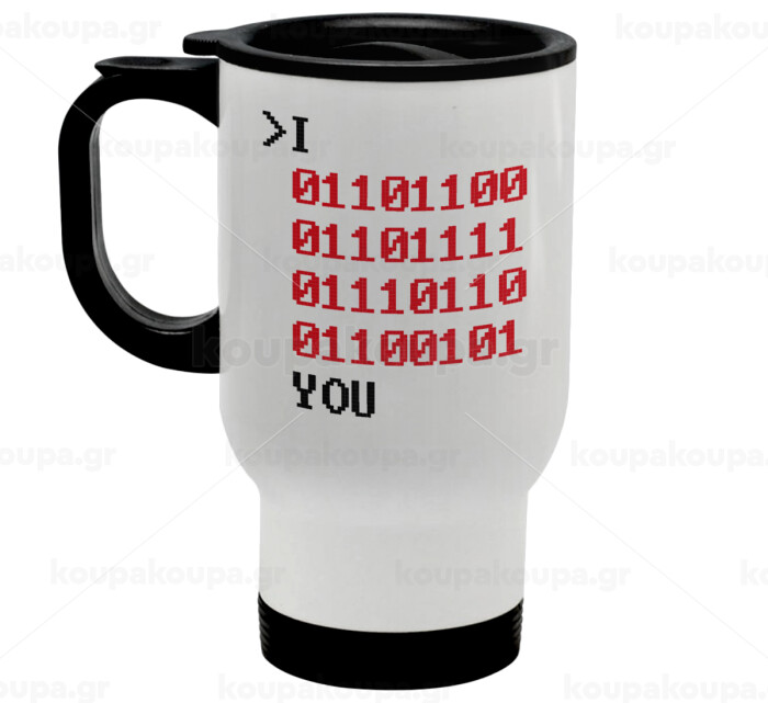 I .... YOU, binary secret MSG, Stainless steel travel mug with lid, double wall white 450ml