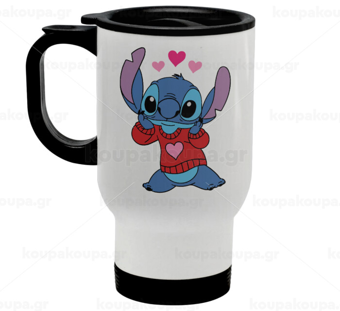 Stitch heart, Stainless steel travel mug with lid, double wall white 450ml