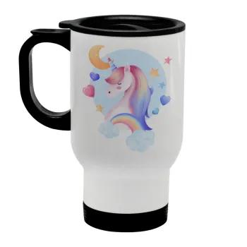 Cute unicorn, Stainless steel travel mug with lid, double wall white 450ml
