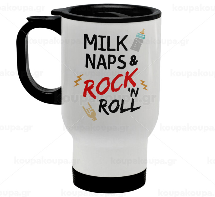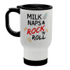 milk naps and Rock n' Roll, Stainless steel travel mug with lid, double wall white 450ml