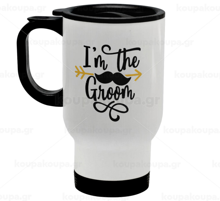 I'm the groom mustache, Stainless steel travel mug with lid, double wall white 450ml